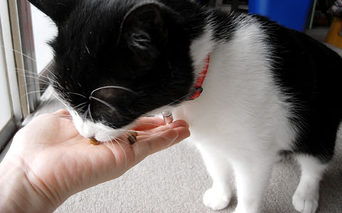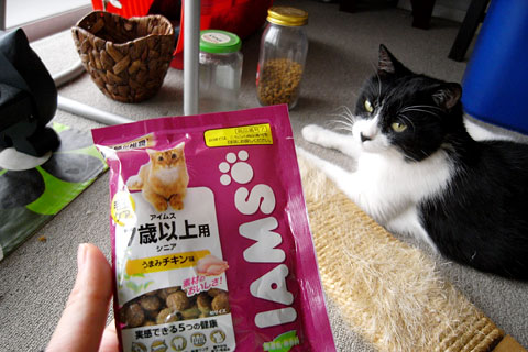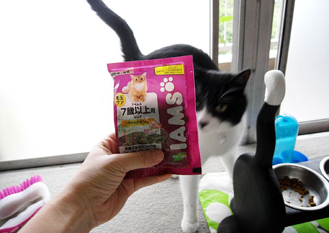 目新しいカリカリにシッポをブルブルさせるシニア