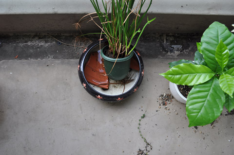 ベランダに放置し一度は枯れかけたパピルスから新しい緑が出てきた。