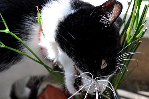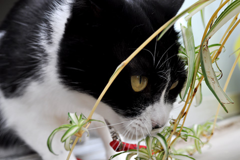伸びても食われる運命...オリヅルラン、毒性はなさそうだけど、どうなのかな?